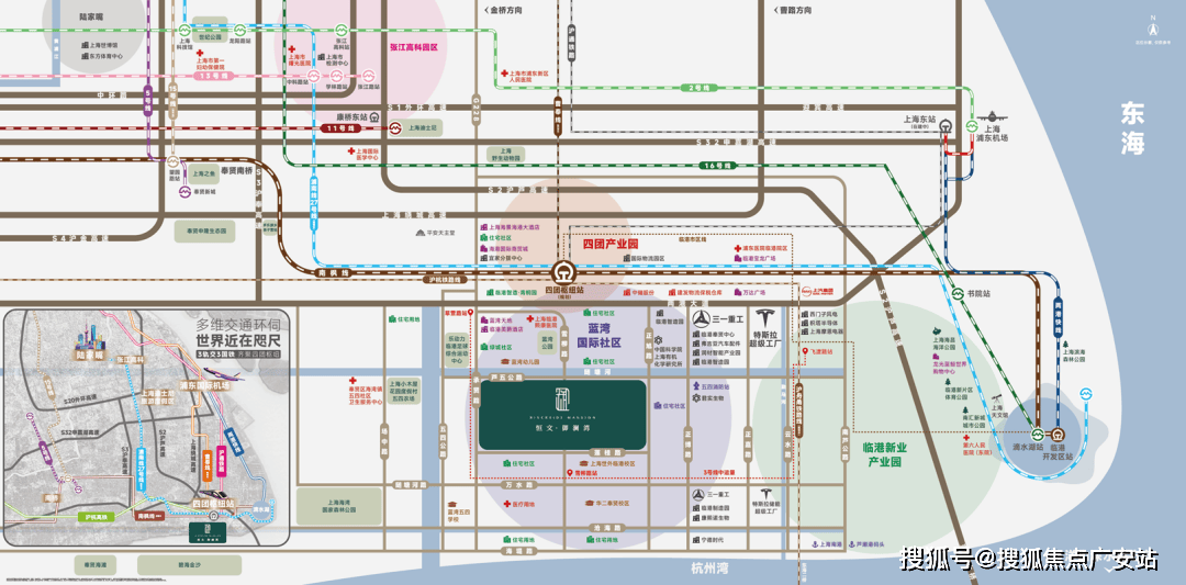 蓝湾坐拥上海临港枢纽(原四团枢纽)的交通红利,汇聚沪乍杭铁路、沪甬通跨海线、两港大道等多维交通。